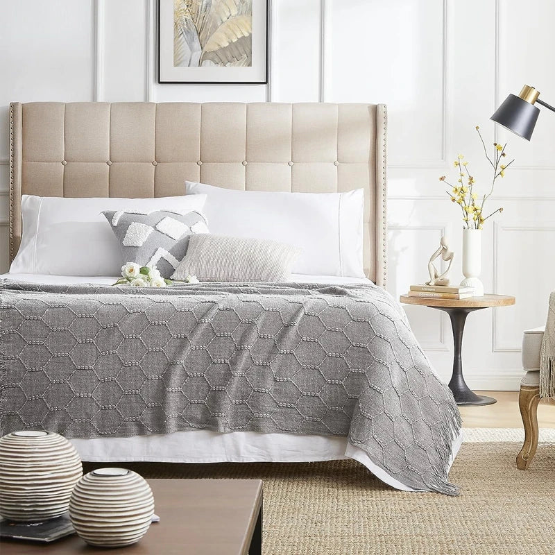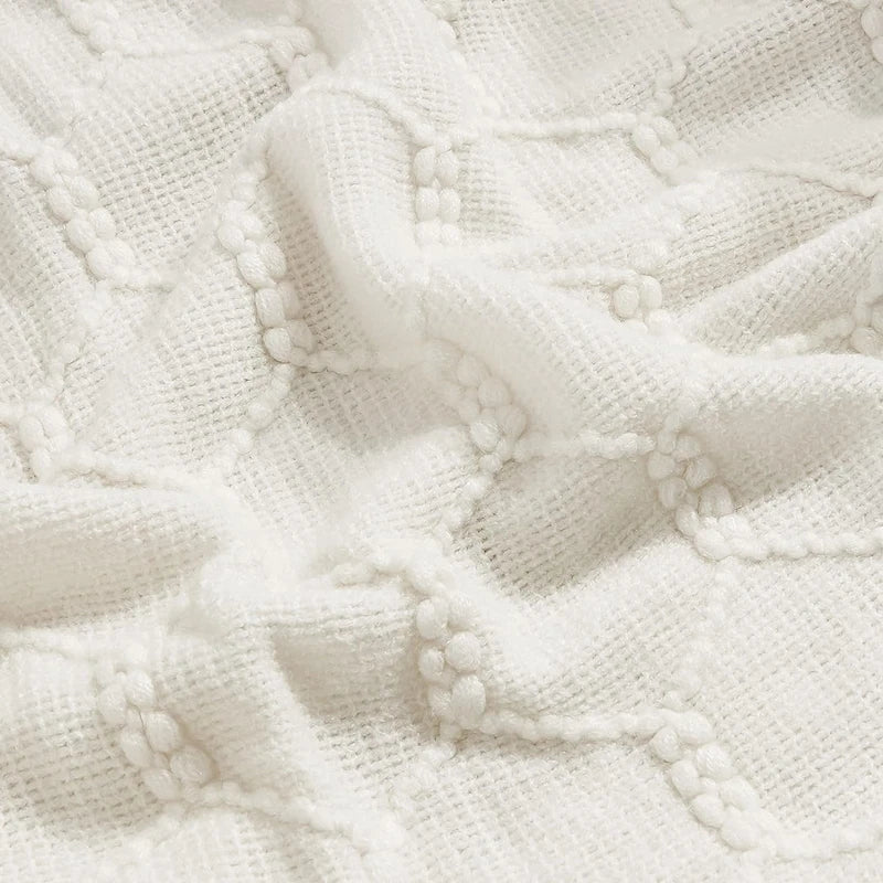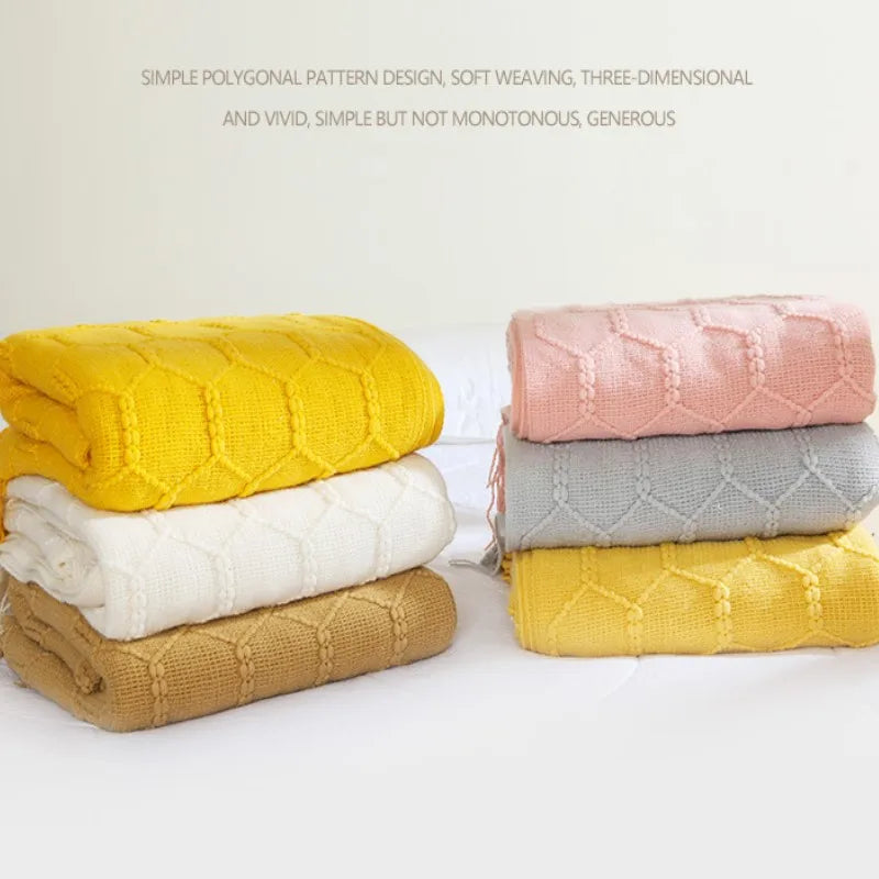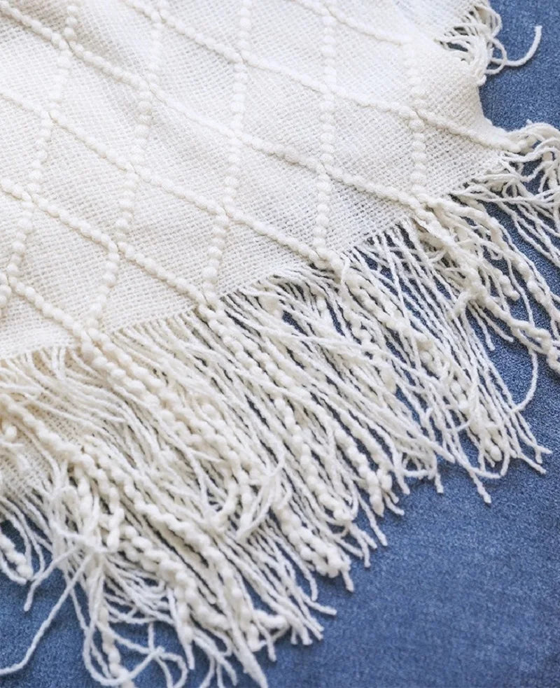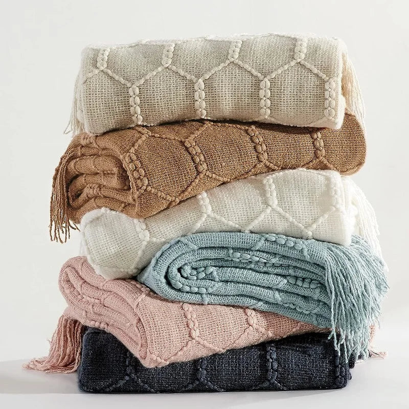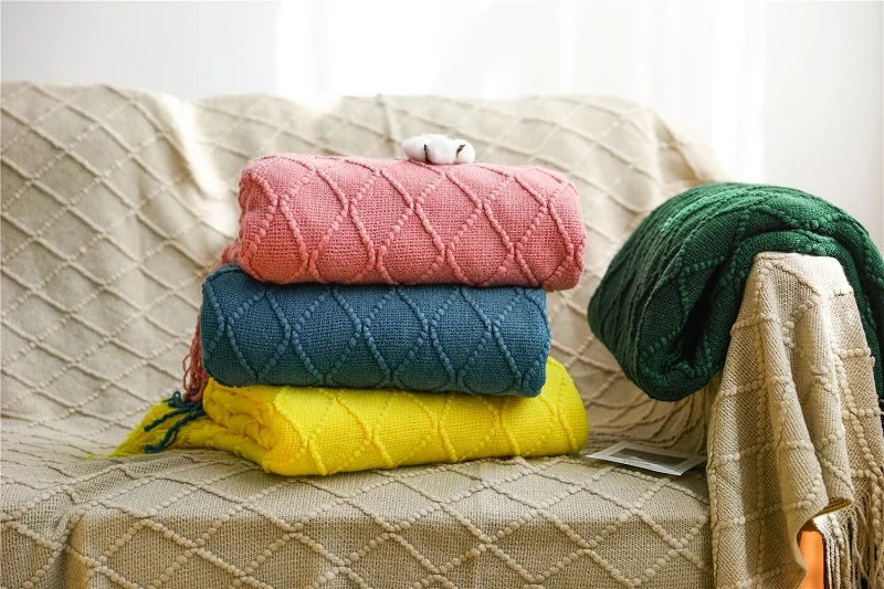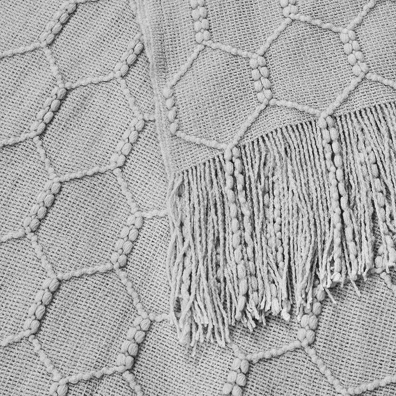 Inya Knit Throw Blanket blends diamond pattern with decorative fringes which will add a classy and elegant finishing touch to your room. Discover year-round warmth and skin-friendly acrylic throw blanket in any place, such as wrapping yourself up with our super soft blanket while having the family movie night on your sofa, couch and bed.